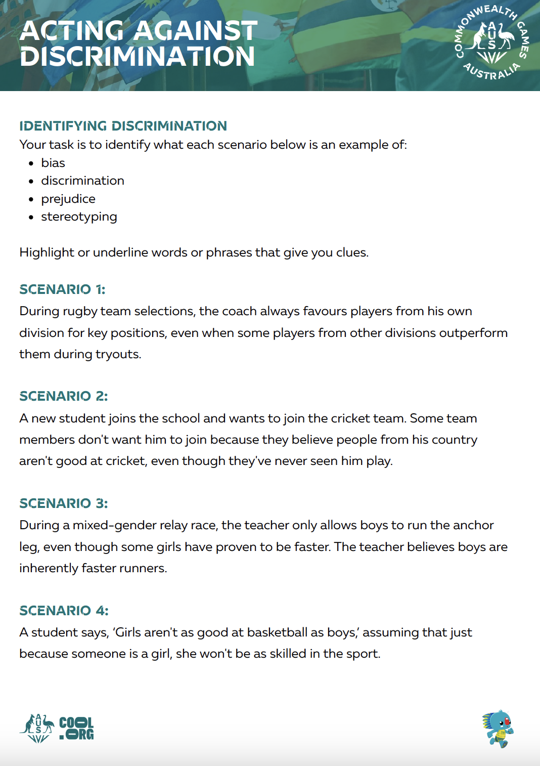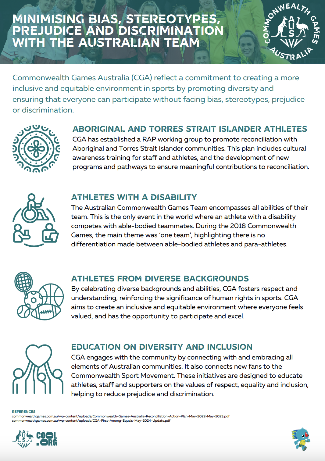 - ‘Minimising bias, stereotypes, prejudice and discrimination within the Commonwealth Games Australia’ Factsheet
