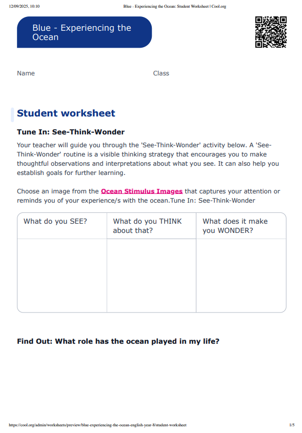 This lesson incorporates clips from Blue The Film as learning inspiration. In this finding out lesson, students will use visible thinking routines to respond to visual stimulus of the the ocean and ocean ecosystems. They will begin to learn about communicating meaning by telling personal stories. They consider ways the ocean is changing as a result of human activities and critically reflect on real or imagined experiences of the ocean. Students also develop their skills in communicating personal experience using reflective language.