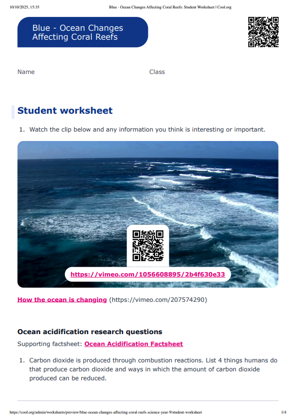 This lesson incorporates clips from Blue The Film as learning inspiration. Students investigate the causes of ocean warming and ocean acidification and analyse their impact on coral reefs. They begin by watching and responding to a clip about how the ocean is changing, and discuss the details of some of these changes. Using the jigsaw classroom method, students then work in groups to undertake research into ocean acidification and coral reefs, and will then work in different groups to make a scientific poster describing how increased carbon dioxide in the atmosphere affects the coral reefs. Finally, students are asked to watch another clip and to reflect on how their impressions of this clip are influenced by the scientific knowledge they acquired throughout this lesson.