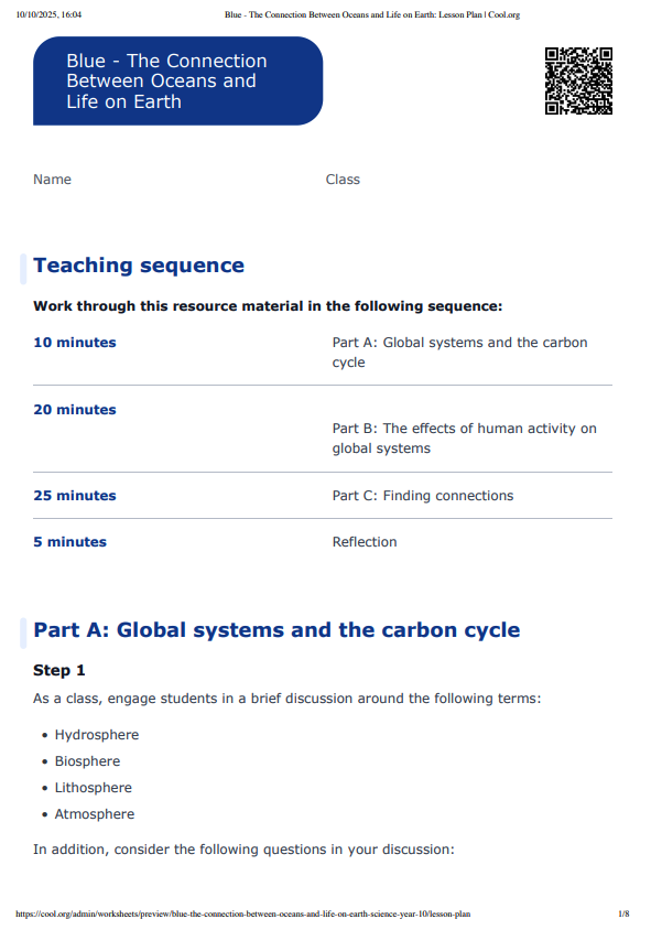 This lesson incorporates clips from Blue The Film as learning inspiration. In this lesson, students investigate the interactions involving the biosphere, lithosphere, hydrosphere and atmosphere. Students begin by refreshing their understanding of key terms and by using the carbon cycle as an example of global system interactions. Students then use information on marine ecosystems to create a diagram showing the interactions between the four global systems.