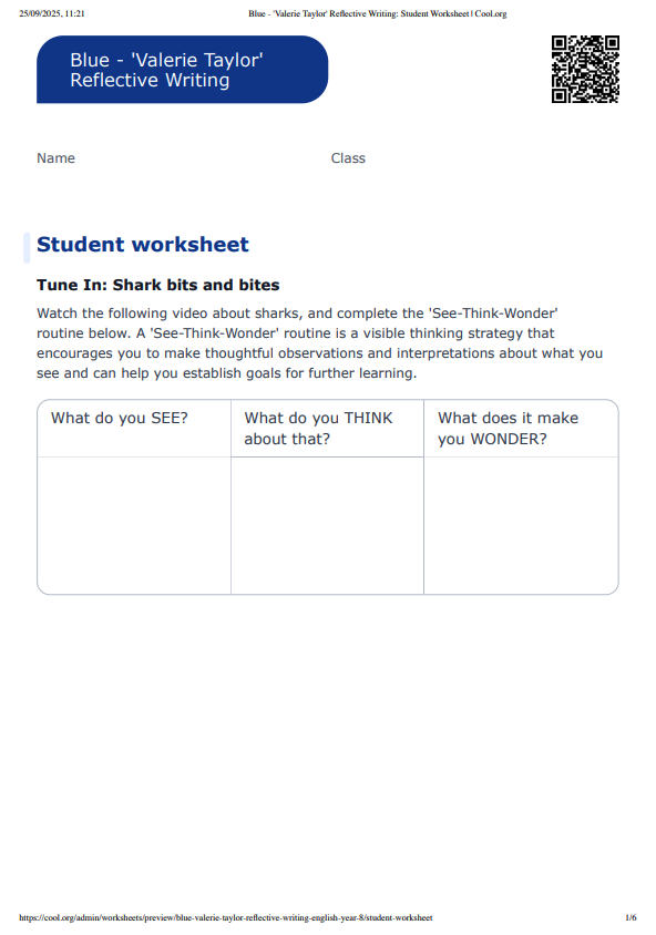 This lesson incorporates clips from Blue The Film as learning inspiration. In this finding out lesson, students will examine reflective language and reflective text structures. They will connect these with the experiences of people who’ve worked to make a difference, with a specific focus on Valerie Taylor. Using a selection of thinking, planning and writing tools, students will conduct an analysis of the role of biographical and reflective language in communicating experience to audiences in a way that can inspire others to take action. They will then create their own texts using reflective language.