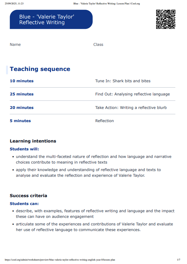- apply their knowledge and understanding of reflective language and texts to analyse and evaluate the reflection and experience of Valerie Taylor.