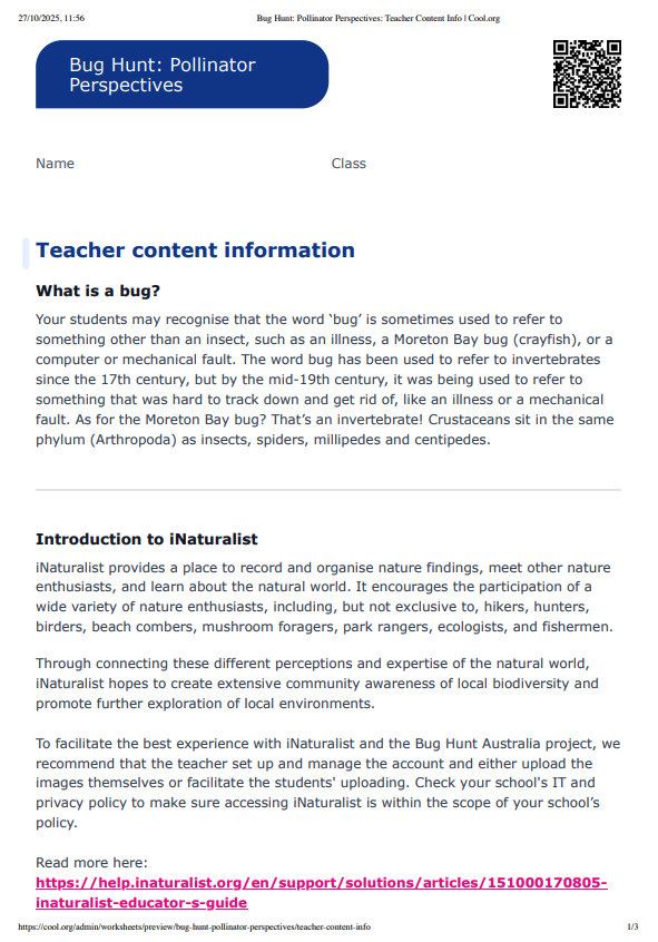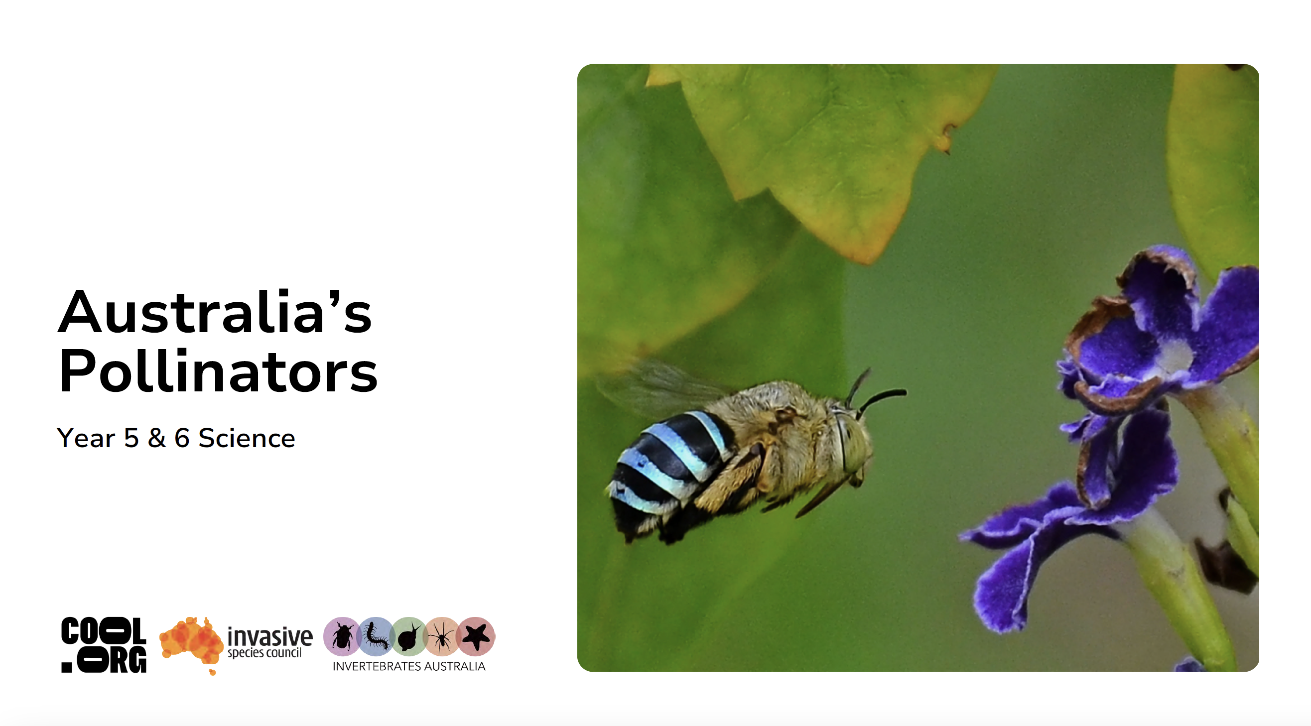 Students will investigate both native and introduced pollinators in Australia. They will explore the features and behaviours of these pollinators, how they created environmental change, and how they are impacted by environmental change. They will then participate in Australia’s Bug Hunt to take observations of pollinators in their local environment and contribute to efforts to protect Australia’s pollinators.