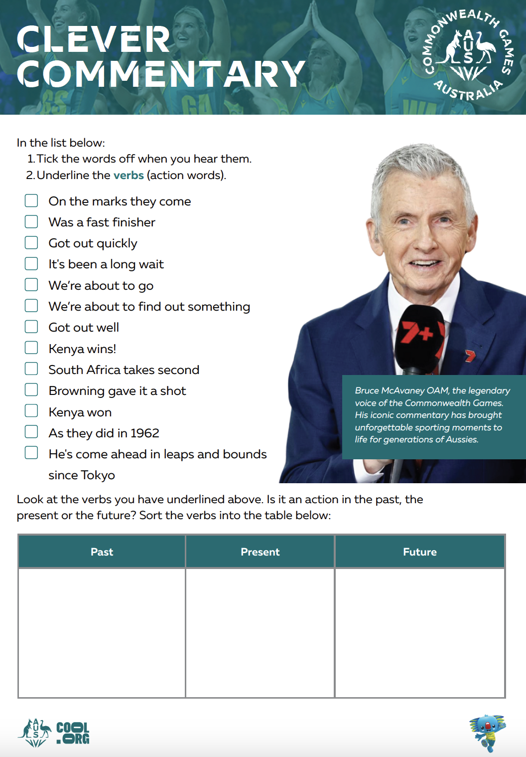 Students will explore past, present and future tenses of verbs by examining Commonwealth Games commentary and writing a sporting commentary of their own.
