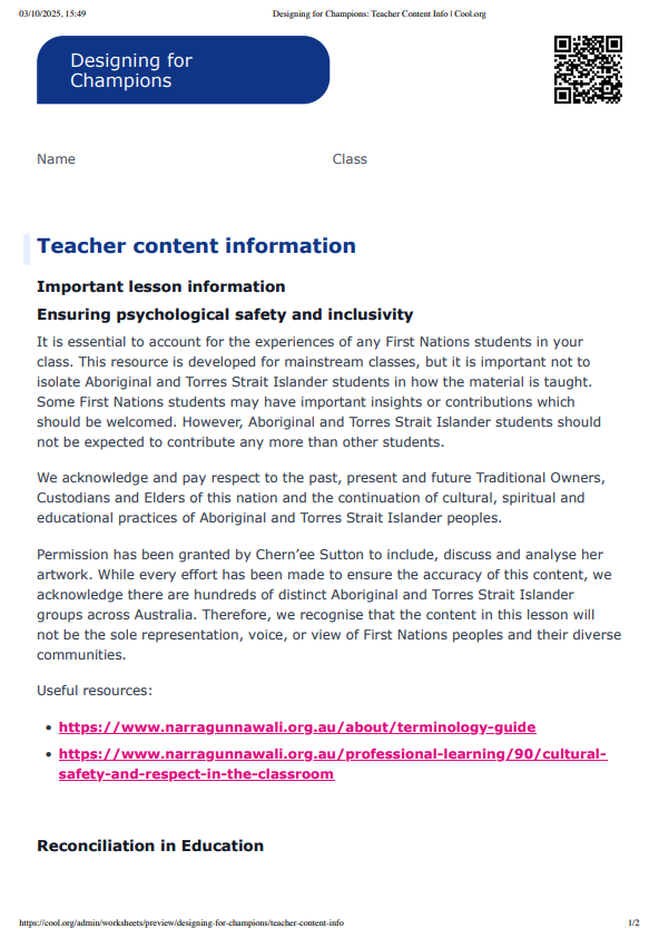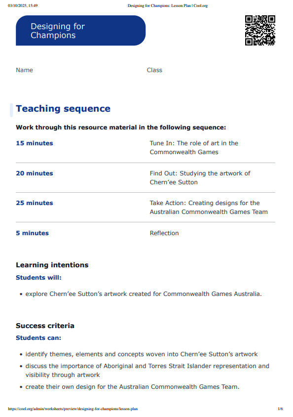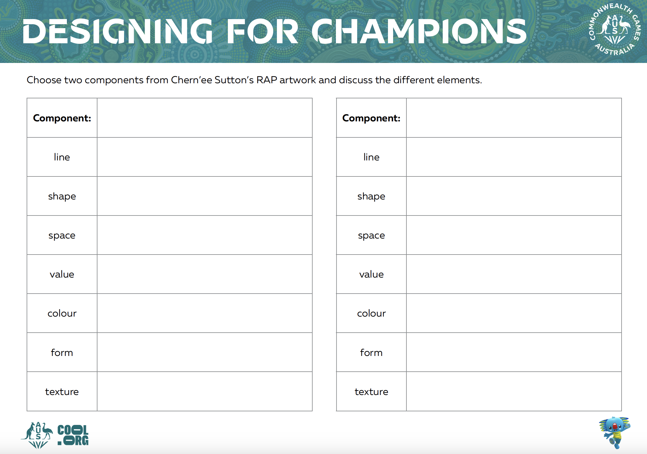 Students will analyse an artwork created by Aboriginal and Torres Strait Islander artist Chern'ee Sutton to explore how patterns, symbols and icons are combined to communicate meaning in visual arts. They will discover how the artist has represented Commonwealth Games Australia’s sporting history using a range of visual elements significant to Aboriginal and Torres Strait Islander peoples. Students will draw on visual elements to inform and inspire their own creative designs for the Commonwealth Games Australian Team.