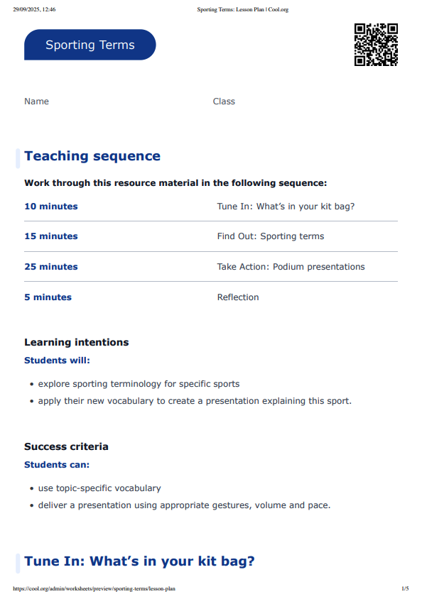 - explore sporting terminology for specific sports