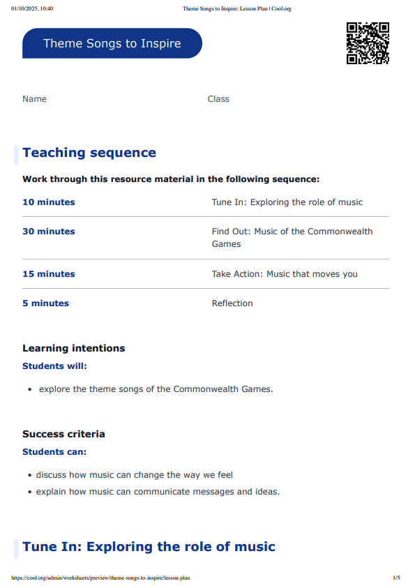 Through exploring examples of Commonwealth Games theme songs, students will learn where, why, and how music is composed and performed by different countries and cultures. Additionally, students will discuss how music has the power to influence how we feel, act and communicate messages and ideas from across the world.