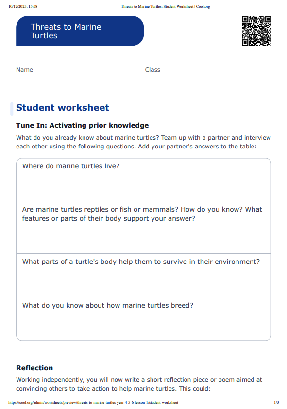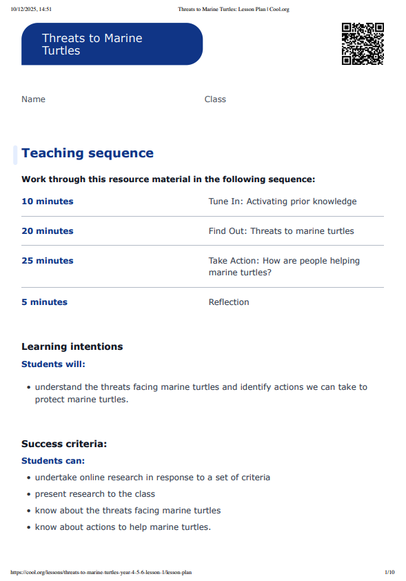 In this lesson students learn about marine turtles and the threats facing them. Students begin by looking at some of the physical characteristics of marine turtles and the features of their life cycle. They then work in groups to investigate the different threats to marine turtles and create a poster or presentation to share with the class. Students then participate in a guided discussion around a video describing how some people are helping marine turtles, and think about the actions we can all take to help marine turtles. Finally, students are asked to work independently to write a poem or reflective piece aimed at convincing people to take action to protect marine turtles. Note: This lesson can be followed by Design a Turtle Nest Protector – Year 4, 5 & 6 – Lesson 2.