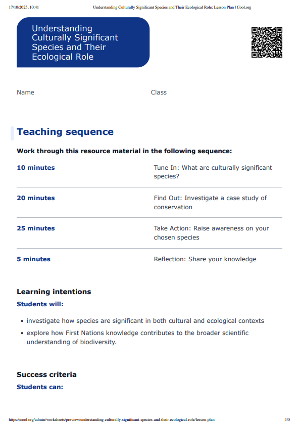 Students will explore culturally significant species and their importance to First Nations peoples. They will analyse a case study from an Aboriginal community working to protect a species. Students will work together to develop an infographic on a species of their choice.