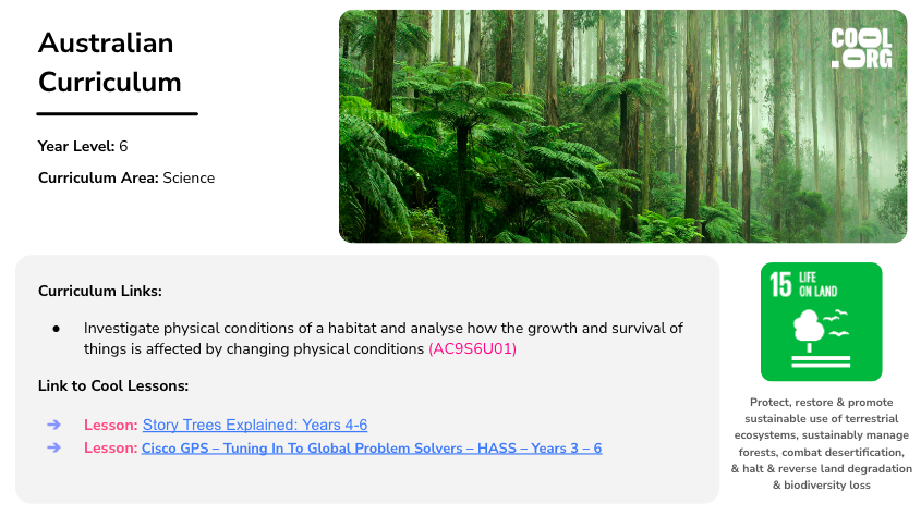 - Investigate physical conditions of a habitat and analyse how the growth and survival of things is affected by changing physical conditions (AC9S6U01)