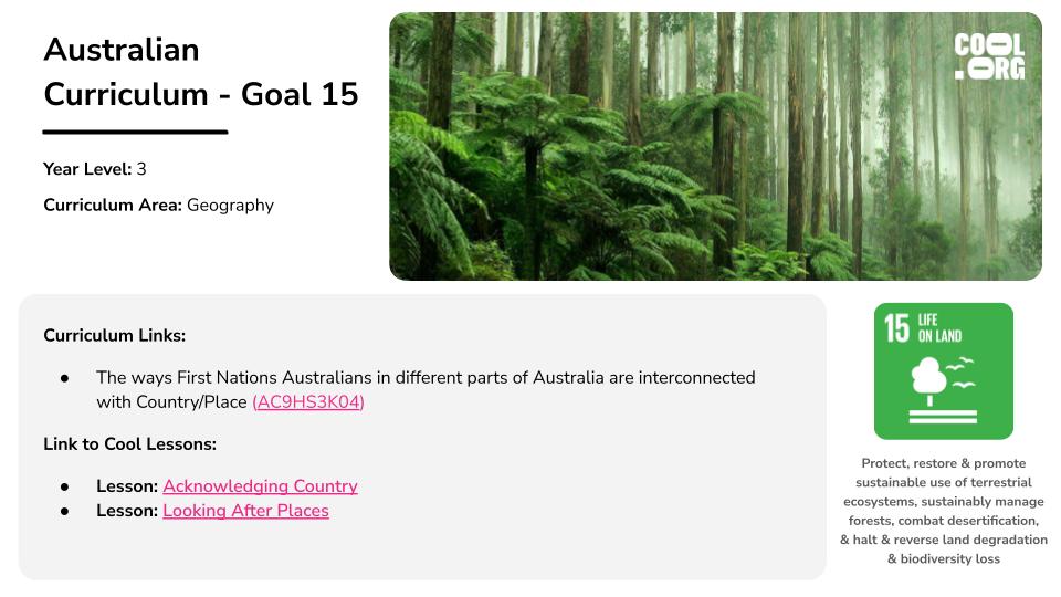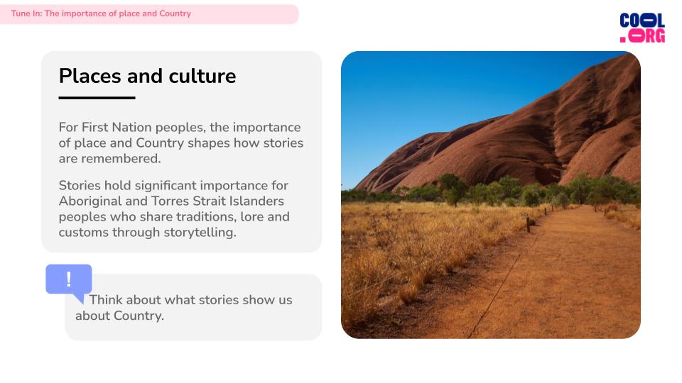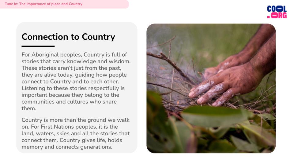 - The ways First Nations Australians in different parts of Australia are interconnected with Country/Place (AC9HS3K04)