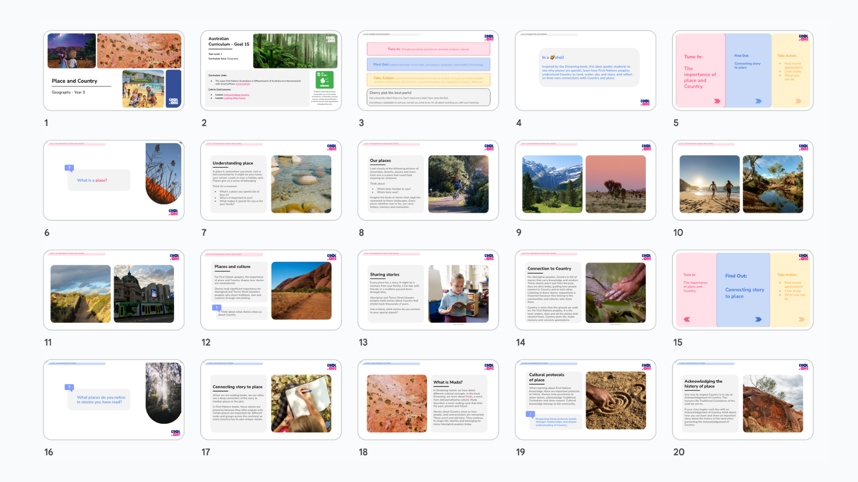 Inspired by the Dreaming book, this deck guides students to see why places are special, learn how First Nations peoples understand Country as land, water, sky, and story, and reflect on their own connections with Country and place.