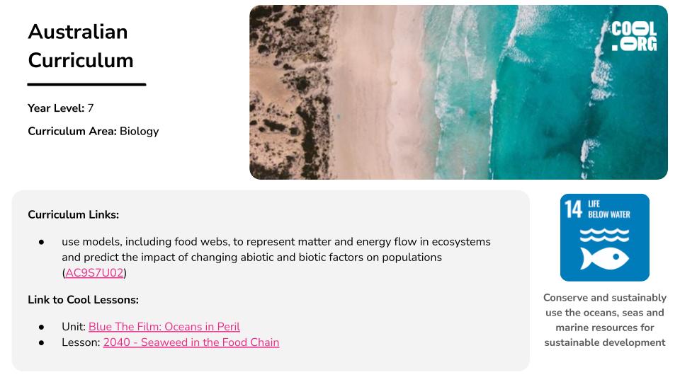 - use models, including food webs, to represent matter and energy flow in ecosystems and predict the impact of changing abiotic and biotic factors on populations (AC9S7U02)